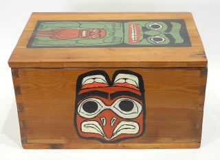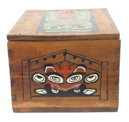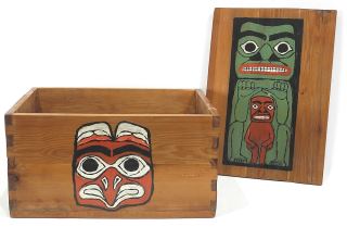 LOT 141 Northwest Coast Painted Cedar Box signed Eldon Schmidt, Kitimat BC, 7 1/2 x 14 x 10". Estimate: $80 - $120 Sold For: $80 Auction Date: Tuesday, June 03 2025 at 4:00 PM