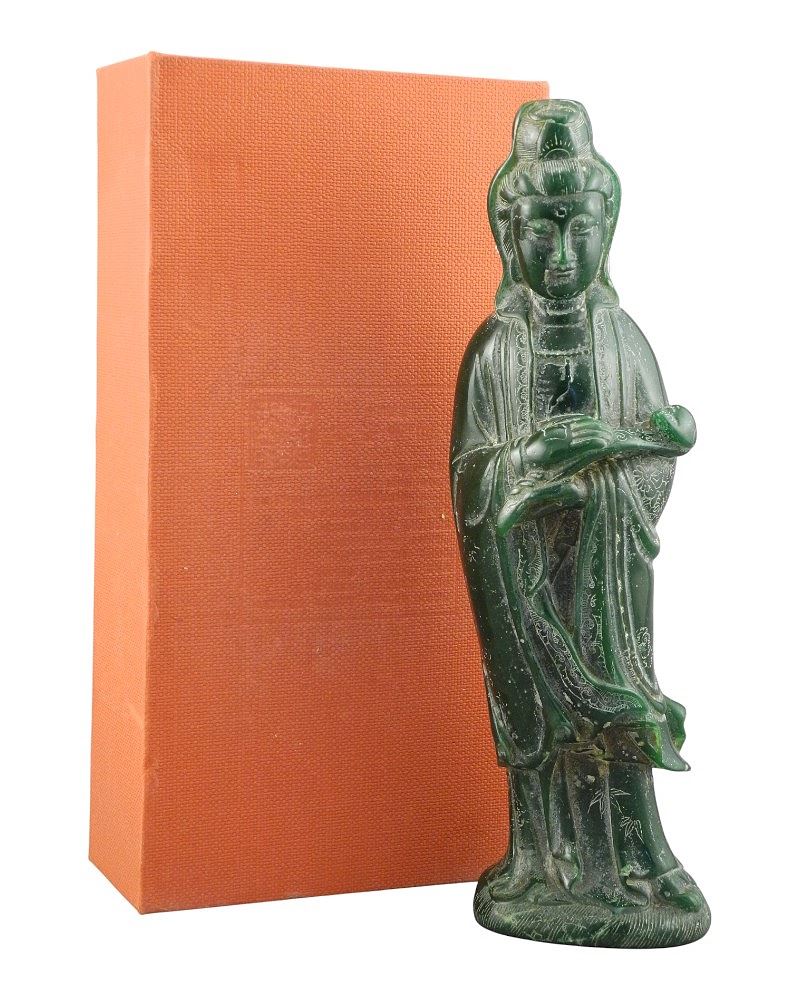 Chinese Green Glass Guanyin Figure, 9 1/2"h.