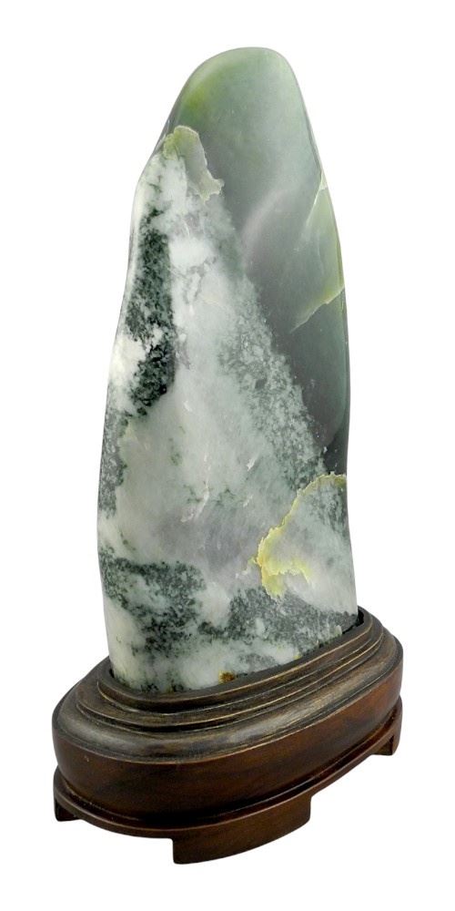 Chinese Green Hardstone "Pine Forest Cloud Sea" Scholars Rock, on Stand, Stone 9 1/2"h.