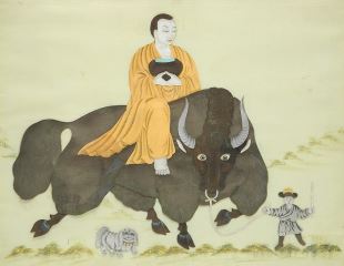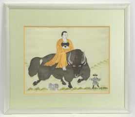 Tibetan Silk Collage, 11 x 14", "Monk Riding Yak".