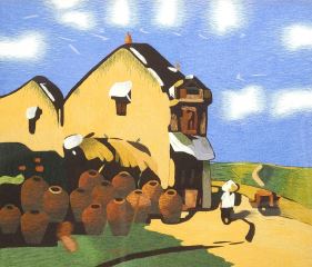 Silk Embroidered Panel by Chan-Thien -My, 20 x 23 3/4", "Pottery Shed".