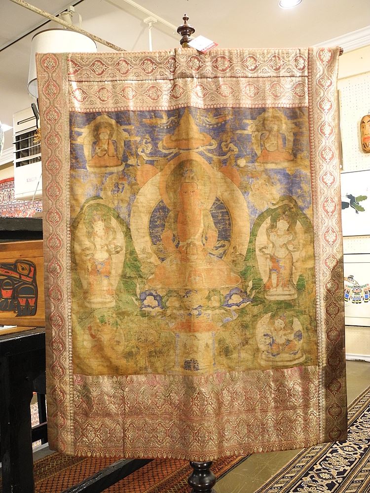 Old Tibetan Thangka (sight 23 x 21") Mounted on Victorian Pole, 60"h.