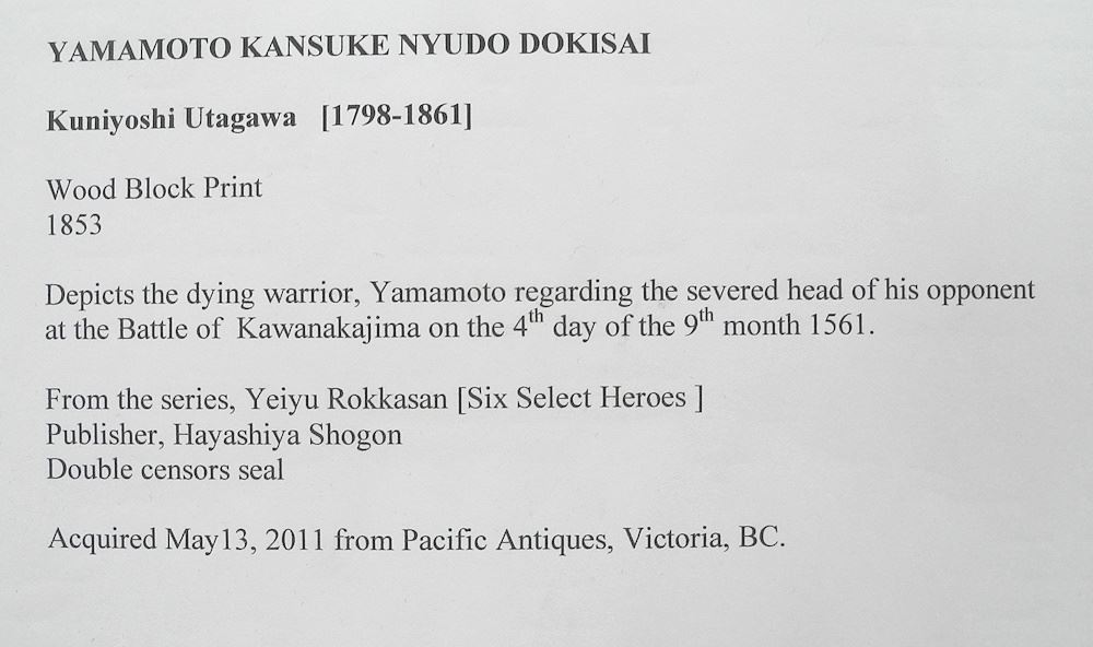LOT 121 Japanese Woodblock Print by Kuniyoshi Utagawa, 14 x 9 1/2", "Yamamoto" (glazing noted) Estimate: $100 - $200 Sold For: $250 Auction Date: Tuesday, November 25 2025 at 4:00 PM