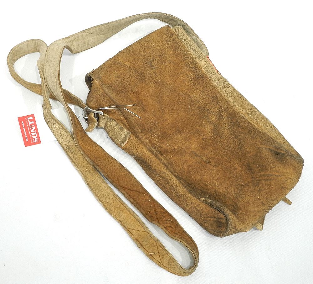 LOT 90 First Nations Beaded Tanned Hide Pouch with Naval Button Closure, 10 1/4"h. Estimate: $100 - $150 Sold For: $95 Auction Date: Tuesday, November 25 2025 at 4:00 PM