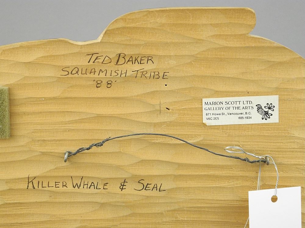 Squamish Plaque signed Ted Baker'88, 16"w, "Killer Whale & Seal" (scuff noted).