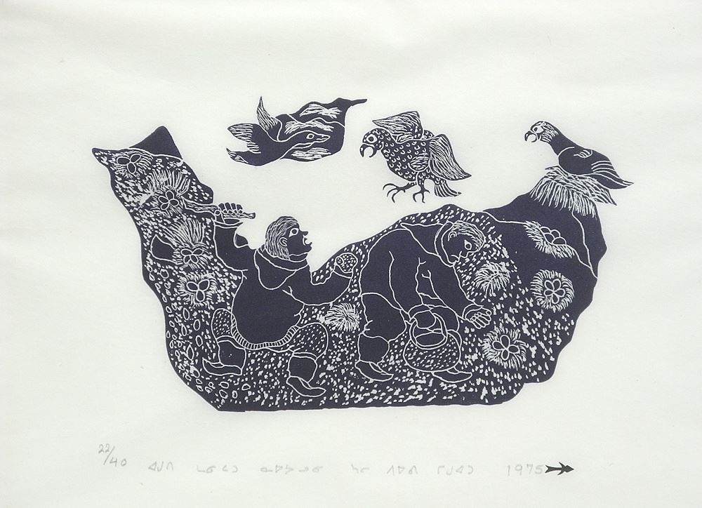 LOT 251 Stonecut by Lucassie Echalook, 11 3/4 x 16 1/2", "2 Men Picking Seagull Eggs" 1975 #22/40. Estimate: $150 - $300 Sold For: $160 Auction Date: Tuesday, November 25 2025 at 4:00 PM