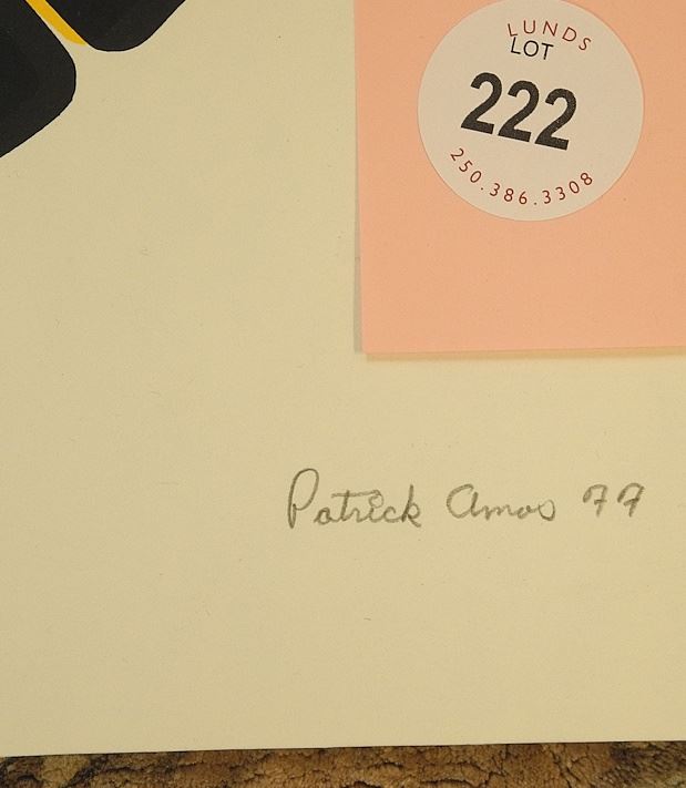 LOT 222 Serigraph signed Patrick Amos, 14 3/8 x 14", "Split Moon" #42/80, Unframed. Estimate: $60 - $100 Sold For: $120 Auction Date: Tuesday, November 25 2025 at 4:00 PM