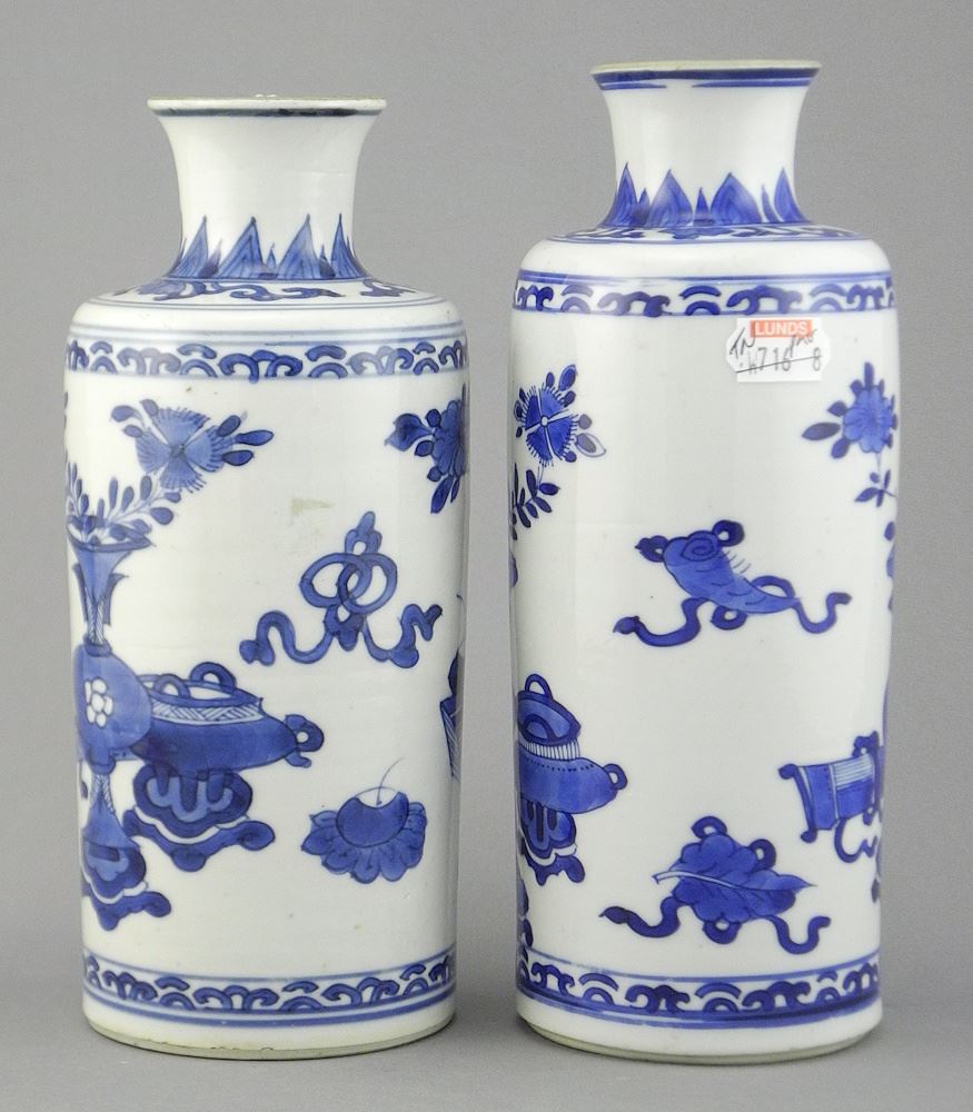 LOT 13 Pair of Chinese Kangxi Porcelain Rouleau Vases, 7 1/8"h. Estimate: $300 - $400 Sold For: $800 Auction Date: Tuesday, March 31 2026 at 4:00 PM