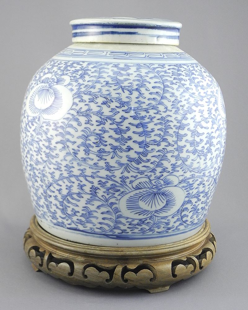 LOT 3 Qing Dynasty Blue & White "Lotus" Ginger Jar with Lid & Stand, 8 1/2"h Estimate: $80 - $100 Auction Date: Tuesday, March 31 2026 at 4:00 PM