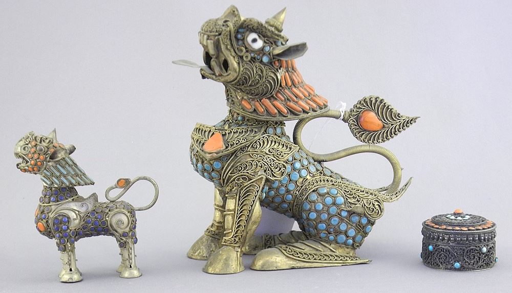 LOT 155 Three Sino Tibetan Coral & Turquoise Inlaid Items: 2 Lion Dogs/Round Box, 7/8 - 6"h. Estimate: $60 - $100 Sold For: $80 Auction Date: Tuesday, March 31 2026 at 4:00 PM