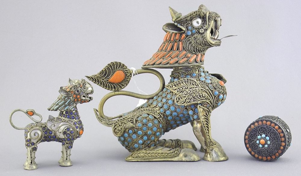 Three Sino Tibetan Coral & Turquoise Inlaid Items: 2 Lion Dogs/Round Box, 7/8 - 6"h.