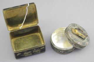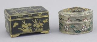 LOT 135 2 Asian Boxes: Chinese Enameled Metal (2 1/8" diam) & Japanese Shakudo, 2 1/2"w. Estimate: $60 - $100 Sold For: $60 Auction Date: Tuesday, March 31 2026 at 4:00 PM