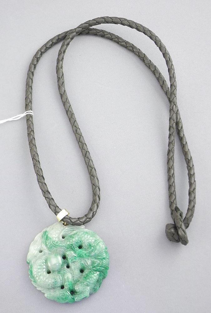 Chinese Green Hardstone "Dragon" Medallion (1 7/8" diam) on Leather Cord, 25"L.