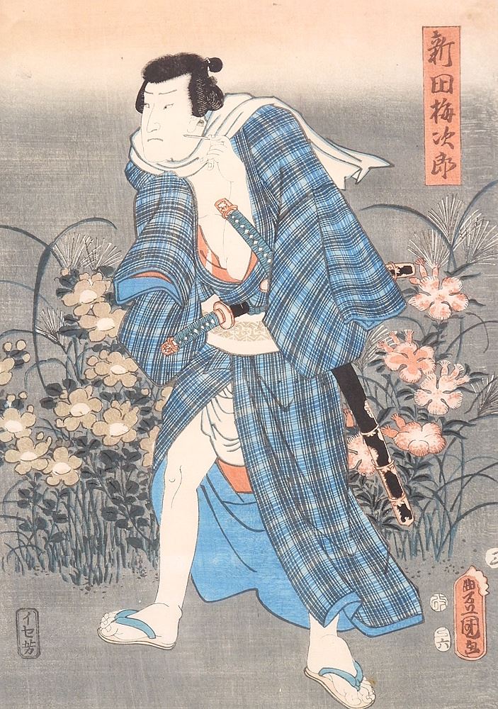 Two Japanese Woodblock Prints by Kunisada, 13 3/4 x 9 1/2", "Samurai" & "Noh Actor".
