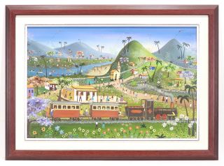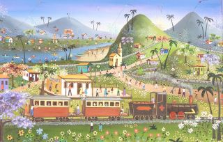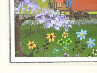 LOT 234 Folk Art Oil on Canvas signed Sherley, 15 1/2 x 23", "Festive Landscape w/Train". Estimate: $60 - $100 Sold For: $30 Auction Date: Tuesday, March 31 2026 at 4:00 PM