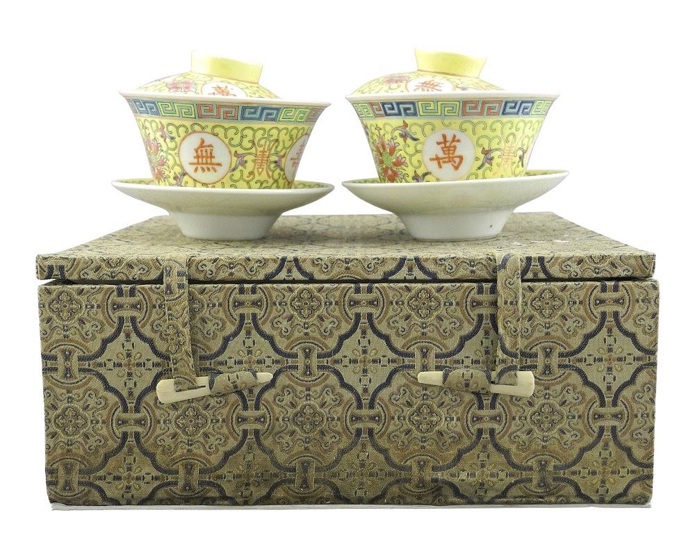 Pair of Early 20th C. Wan Shou Wu Jiang" Porcelain Cover Tea Cups with Case.