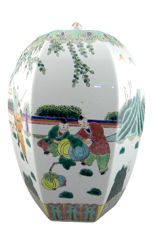 LOT 344 Chinese Hexagonal Famille Rose Porcelain Lantern signed "9 Children " Covered Vase, 13"h. Estimate: $100 - $200 Auction Date: Tuesday, March 31 2026 at 4:00 PM