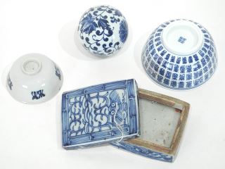 LOT 247 Collection of Chinese Blue & White Porcelain Saucer Dishes/Dishes/Box/ Ball. Estimate: $50 - $150 Sold For: $45 Auction Date: Tuesday, March 31 2026 at 4:00 PM