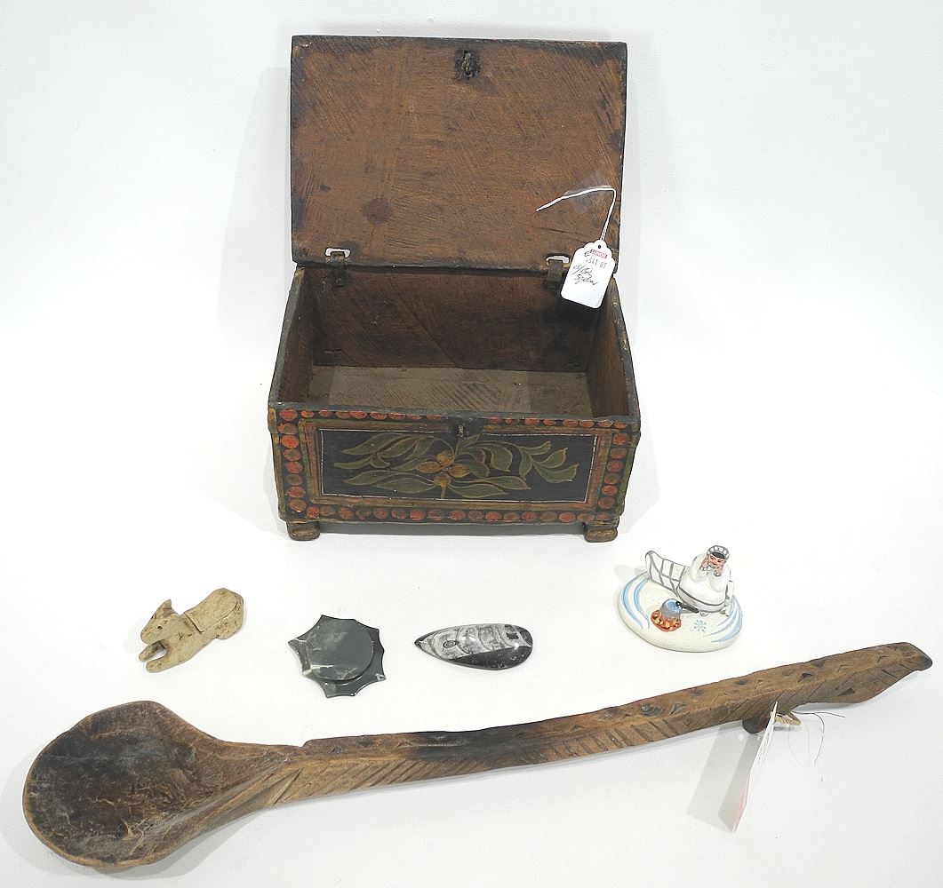 LOT 210 South Asian Polychrome Wood Box Containing Sundries with Wood Spoon, 21 1/2"L. Estimate: $50 - $100 Sold For: $15 Auction Date: Tuesday, March 31 2026 at 4:00 PM