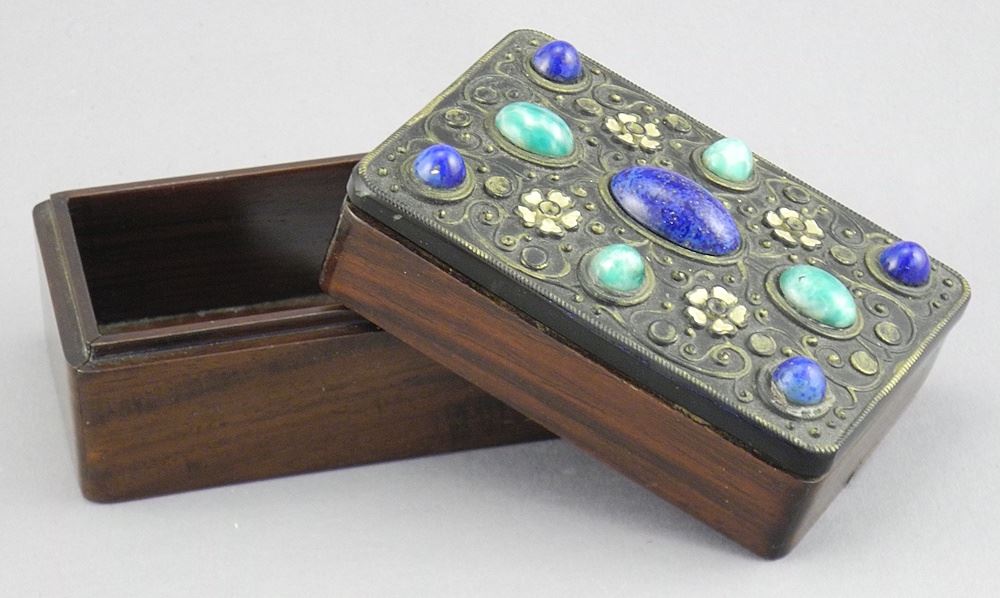 Chinese Rosewood Box with Stone Inlaid Enameled Metal Cover, 2 1/4"h (minor restoration).