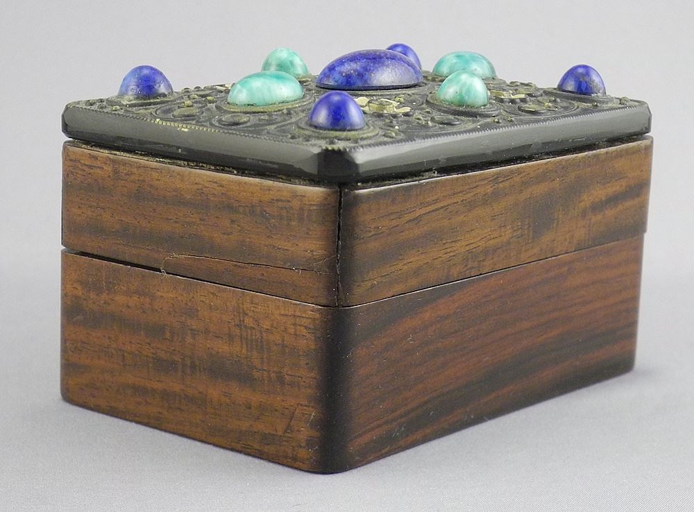 LOT 97 Chinese Rosewood Box with Stone Inlaid Enameled Metal Cover, 2 1/4"h (minor restoration). Estimate: $60 - $100 Sold For: $60 Auction Date: Tuesday, March 31 2026 at 4:00 PM