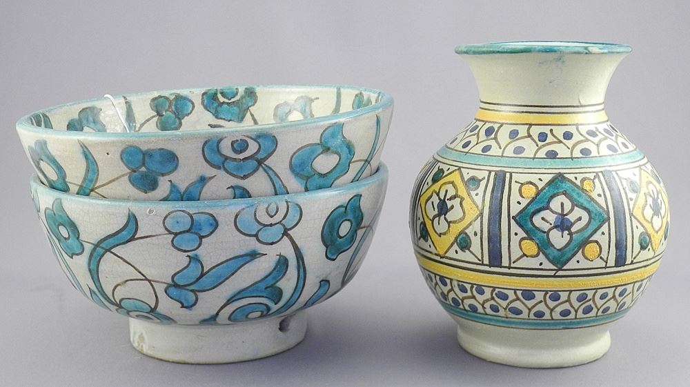 LOT 120 Three Pieces of Moroccan Patterned Pottery Bowls & Vase. Estimate: $50 - $60 Sold For: $50 Auction Date: Tuesday, March 31 2026 at 4:00 PM