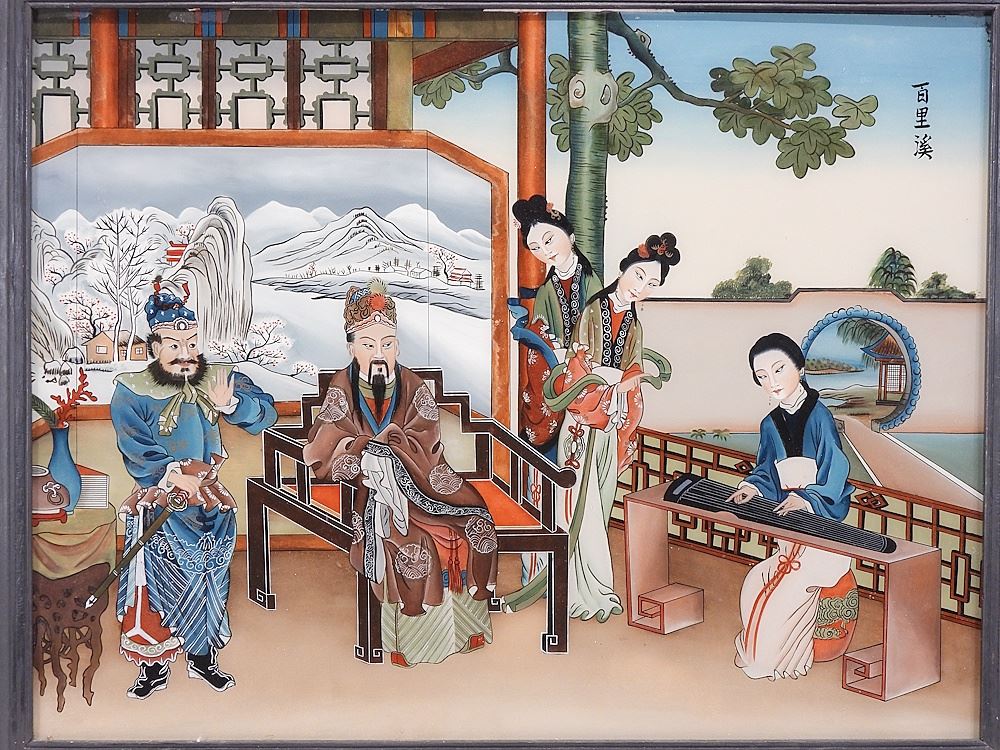 Chinese Reverse Painting on Glass, 17 5/8 x 23 1/4" "Musical Audience".