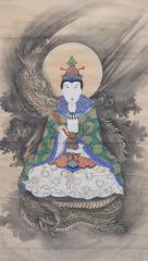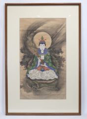 19th C. Ink & Colour on Paper, 28 1/2 x 16 1/2" "Boddisatva Seated On A Dragon".