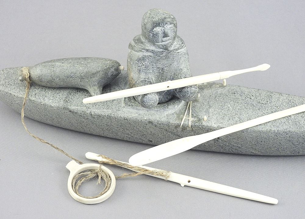 LOT 180 Inuit Stone & Antler Sculpture signed Noah (Jaw), 12 5/8"L "Kayak Hunter w/Seal/Equip.". Estimate: $200 - $300 Auction Date: Tuesday, March 31 2026 at 4:00 PM