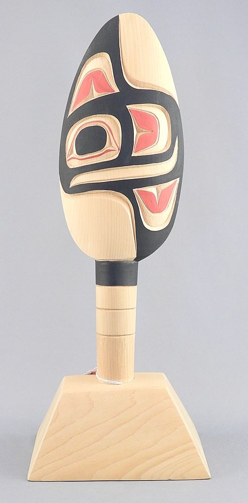 LOT 383 Coast Salish "Mussel Rattle" signed James Johnny Jr, 12"h, Includes Stand. Estimate: $100 - $150 Sold For: $200 Auction Date: Tuesday, March 31 2026 at 4:00 PM