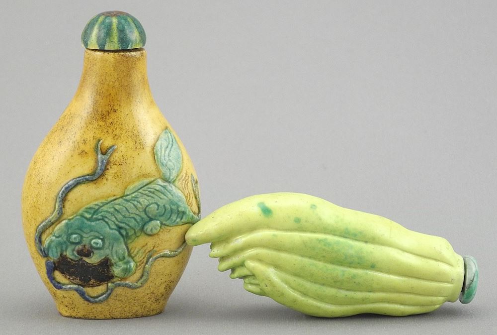 LOT 95 Two Chinese Porcelain Snuff Bottles, Fahua Style & Finger Citron, 2 7/8"h Estimate: $80 - $100 Sold For: $70 Auction Date: Tuesday, March 31 2026 at 4:00 PM