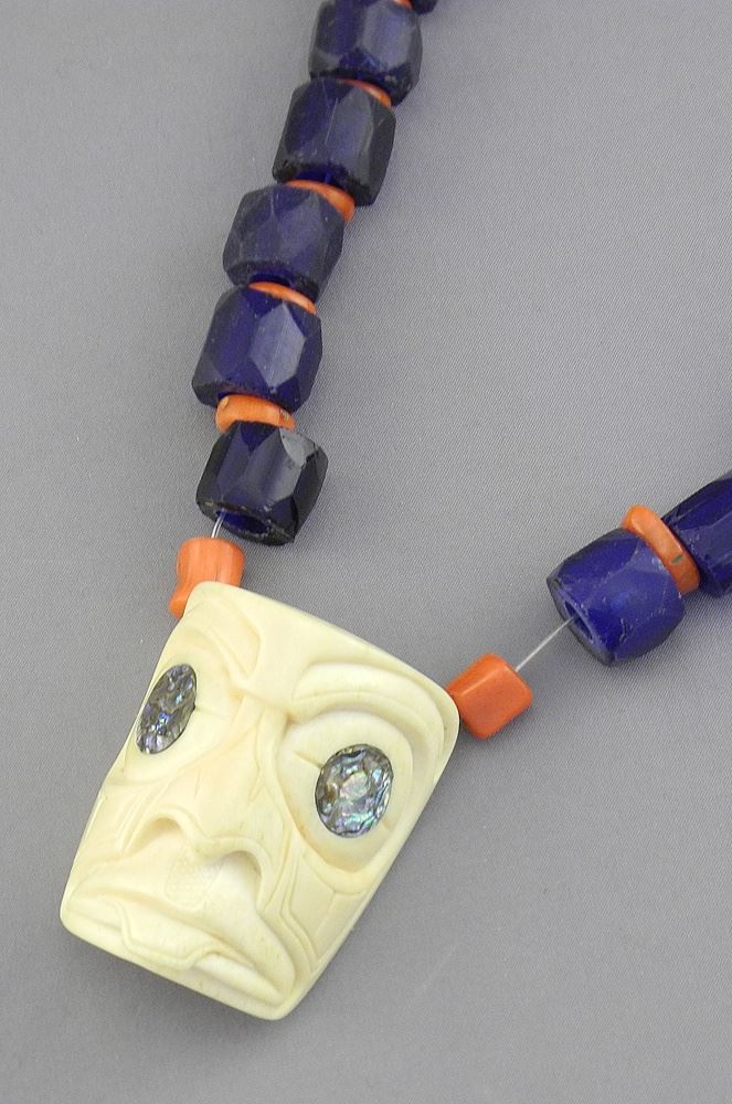 LOT 244 Strand of Blue Glass Trade Beads with Bone "Mask" Pendant signed S.W. Miiko, 30"L. Estimate: $120 - $180 Sold For: $400 Auction Date: Tuesday, March 31 2026 at 4:00 PM