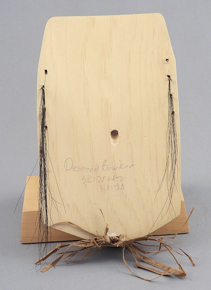 LOT 81 Haida Cedar Copper & Abalone Mask Carving signed Desmond Bowker, 7 3/4 " "Bear Mother". Estimate: $180 - $250 Sold For: $190 Auction Date: Tuesday, March 31 2026 at 4:00 PM