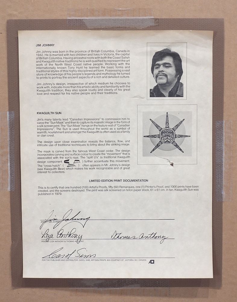 LOT 253 Kwagiulth Serigraph signed J. (Jim) Johnny, 21 1/4 x 22 3/4" "Kwagiulth Sun" #501/1000/79. Estimate: $80 - $120 Sold For: $70 Auction Date: Tuesday, March 31 2026 at 4:00 PM