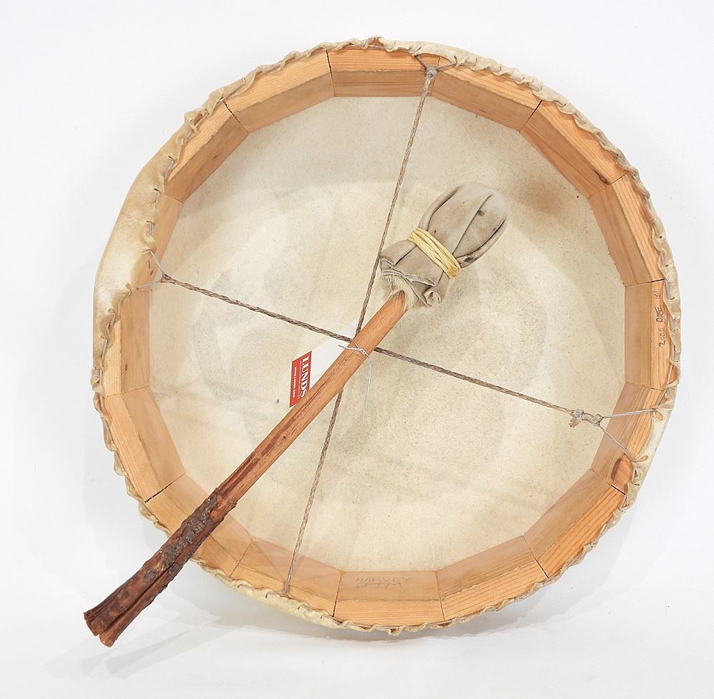 LOT 291 Northwest Coast Hide Drum signed Harvey Jim, 2 5/8 x 15" Diameter "Double Frog". Estimate: $60 - $100 Sold For: $60 Auction Date: Tuesday, March 31 2026 at 4:00 PM