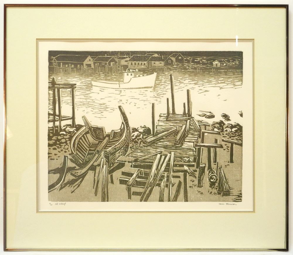 Woodblock Print Signed Sam Black, 15 5/8" x 19 5/8", "Old Wharf", #10/25.