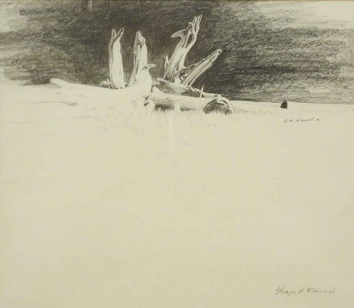 LOT 127 Drawing signed Keith Hiscock, 8 7/8" x 10", "Stumps at Wickaninnish". Estimate: $100 - $200 Auction Date: Tuesday, May 07 2024 at 4:00 PM