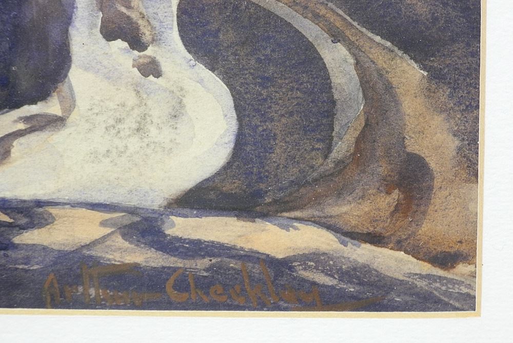 LOT 28 Watercolour signed Arthur Checkley, 6" x 8", "Mountain Scape with Glacier". Estimate: $50 - $80 Sold For: $50 Auction Date: Tuesday, July 23 2024 at 4:00 PM