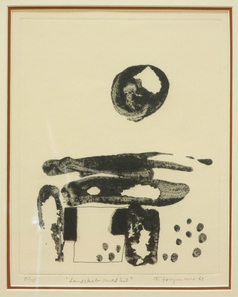 Print signed F. (Flemming) Jorgensen 67', 9 1/2" x 7 1/2", "Landskab Aved Sol".