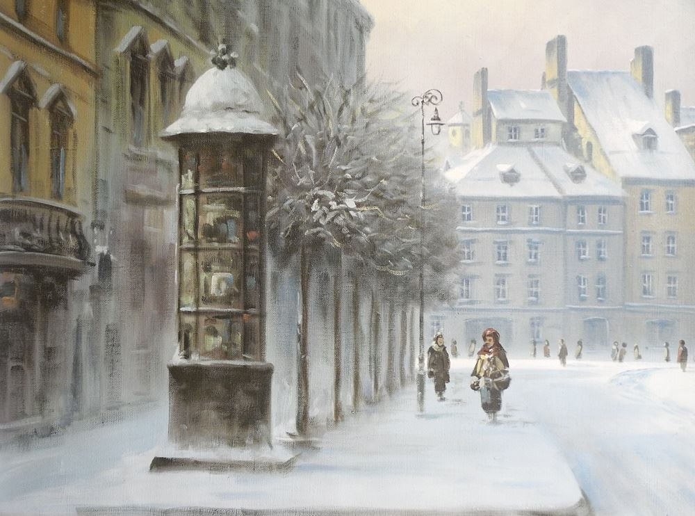 Oil on Canvas signed G. (Georges) Csapo, 24" x 48", "Troika Dashing Through Square".