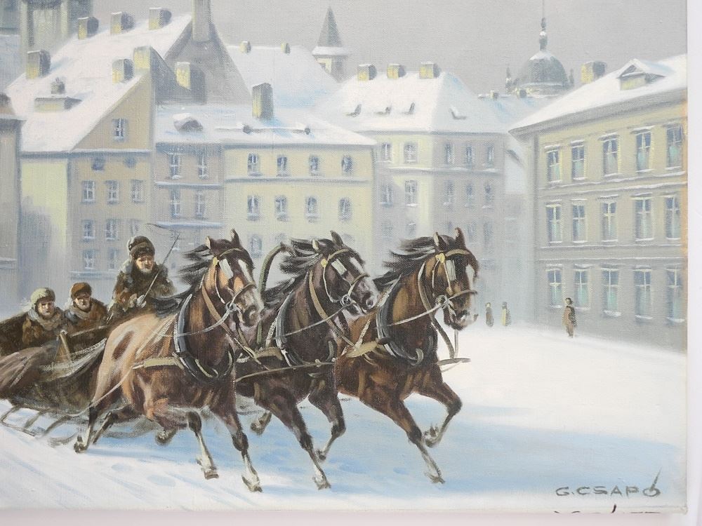 LOT 152 Oil on Canvas signed G. (Georges) Csapo, 24" x 48", "Troika Dashing Through Square". Estimate: $200 - $400 Sold For: $300 Auction Date: Tuesday, July 23 2024 at 4:00 PM