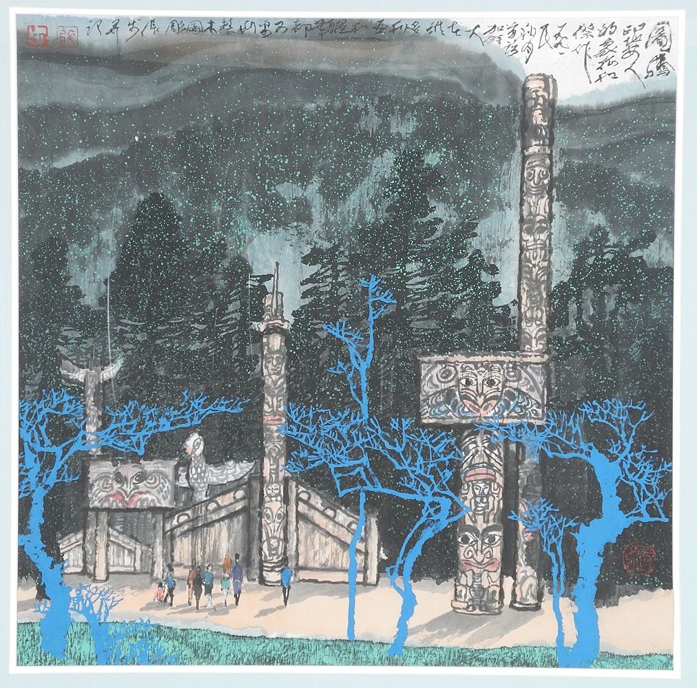 LOT 157 Watercolour signed Zhang Bu, 26 1/2" x 26 1/2", "Totems & Long Houses". Estimate: $1,000 - $1,500 Sold For: $1,100 Auction Date: Tuesday, December 17 2024 at 4:00 PM