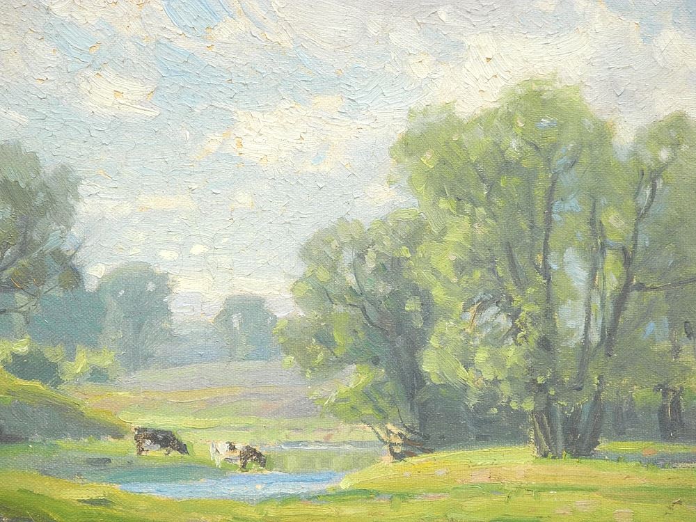 LOT 3 Oil on Artists Board signed F.H. (Frederick Henry) Brigden, 8 5/8" x 11", "Cows Watering" (loss Estimate: $150 - $350 Sold For: $150 Auction Date: Tuesday, December 17 2024 at 4:00 PM