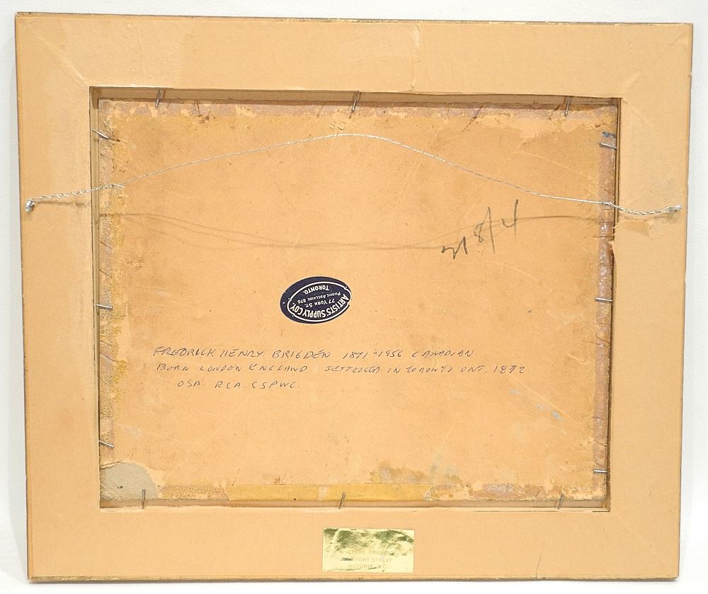 Oil on Artists Board signed F.H. (Frederick Henry) Brigden, 8 5/8" x 11", "Cows Watering" (loss
