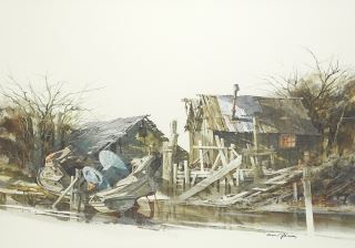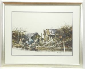 LOT 74 Watercolour signed Brian R. Johnson, 16 3/8" x 23", "Yesterdays Boatyard" Estimate: $200 - $400 Sold For: $300 Auction Date: Tuesday, December 17 2024 at 4:00 PM