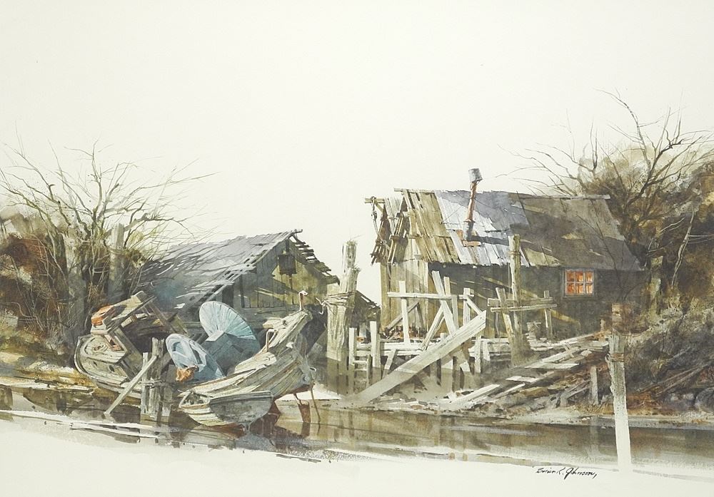 Watercolour signed Brian R. Johnson, 16 3/8" x 23", "Yesterdays Boatyard"