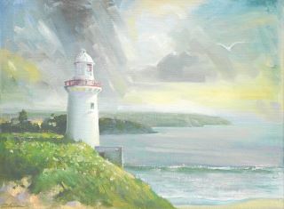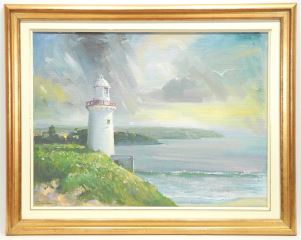 Oil on Board signed (Ron) Wilson, 18 " x 24", "Irish Lighthouse" with Auction Catalogue.