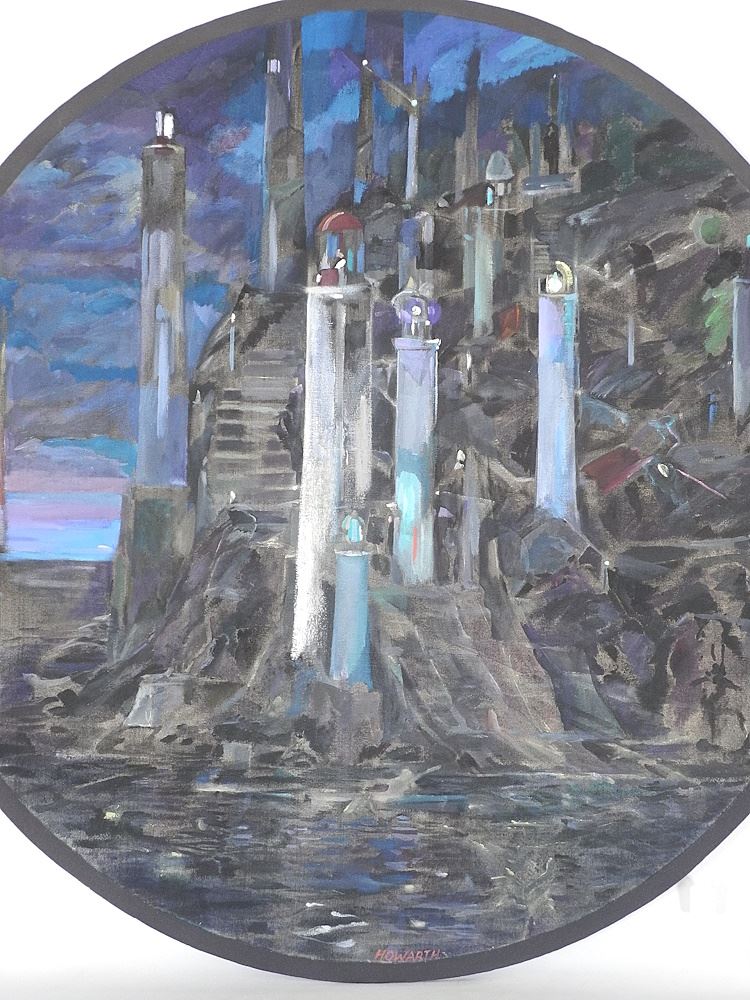 LOT 139 Oil on Canvas signed Howarth, 45 1/8" Diam., "Rocky Shore with Lights". Estimate: $100 - $200 Auction Date: Tuesday, December 17 2024 at 4:00 PM