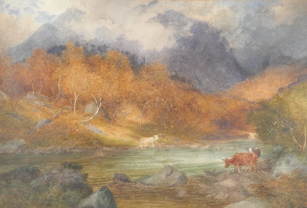 LOT 80 Watercolour signed M. S******, 15" 22", "Cow's Watering". Estimate: $100 - $150 Auction Date: Tuesday, December 17 2024 at 4:00 PM