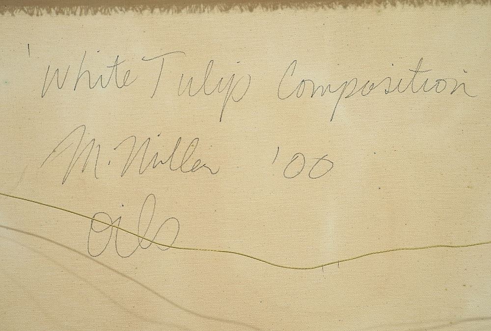 Oil on Canvas signed M. (Michelle) Miller'00, 53 3/4 x 42", "White Tulips Composition".
